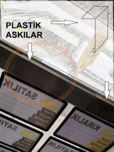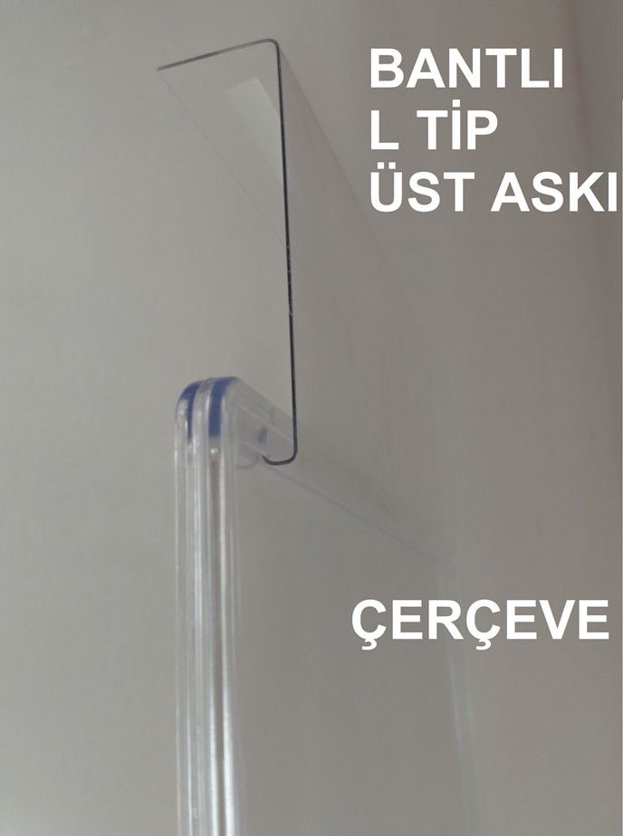 L TİP PLASTİK ASKILI ÇERÇEVELER İSE BOYDAN BOYA OLMAYAN VİTRİN CAMLARINDA KULLANILABİLİR,   BİLİNDİĞİ ÜZERE ÇOĞU VİTRİNDE ÜSTTEKİ DAR CAM İLE ALTTAKİ VİTRİN CAMINI AYIRAN SOLDAN SAĞA KAYIT VARDIR. ÇİFT TARAFLI BANDLI L TİP PLASTİK ASKI İLE HER ÇERÇEVE TAKIMI AŞAĞI DOĞRU ASILIR.